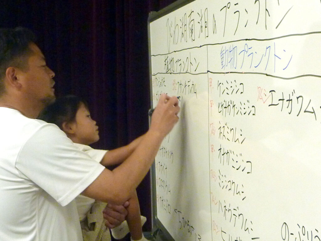 資料を見ながらホワイトボードに生きものの名前を書き込んでいきます。